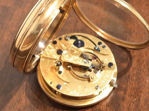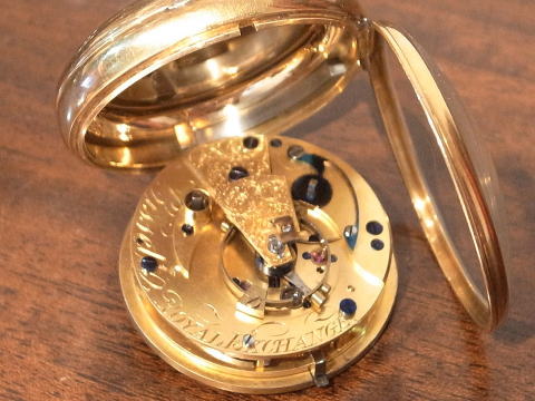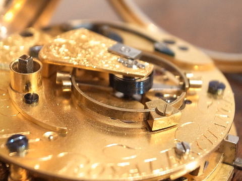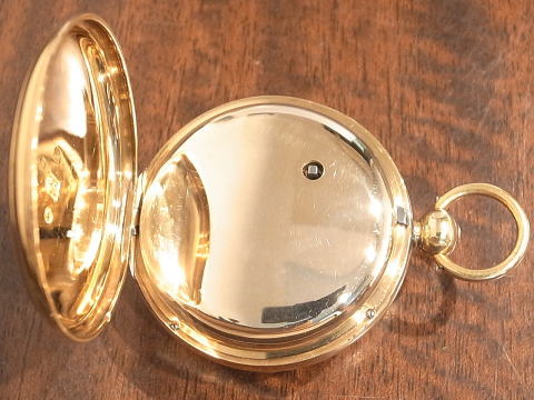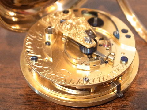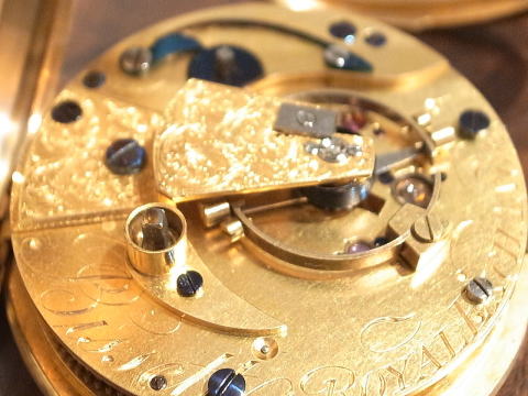 | コメント | イギリスのBissettが製作しました、デテントクロノメーターとなります。 何と言いましても機械が凄すぎ、見所満載と言った所でしょう。 提灯ヒゲは勿論ですが、天輪にあります重り、これを見ているだけでも楽しめます。 このタイプのデテントクロノメーターは他の時計とは全く違う時計と言って良い。 実際の時計も大きく分厚く、抜群の存在感を感じて頂けます。 Bissettはロンドンで1815年から24年となります。 ホールマークからは1825年製造ですので最終年に製作したのでしょう。 何と丁度200年前! 100年では無く200年ですから懐中時計の歴史は本当に長く奥が深い。 まさに歴史を感じて頂けるとは、この様な事でしょうね。 当店にて完全分解整備済み、ご安心してこの素晴らしい時計をお楽しみ頂けます。 凄まじく最強の時計で破壊力抜群です! |