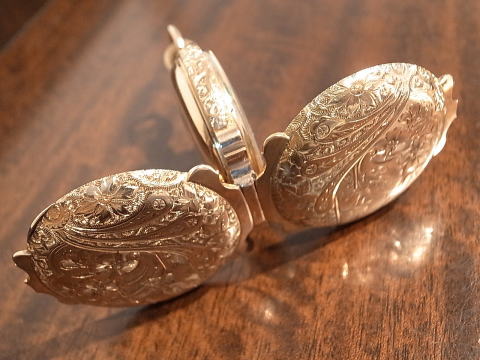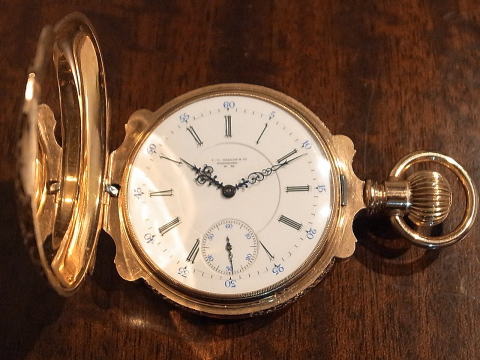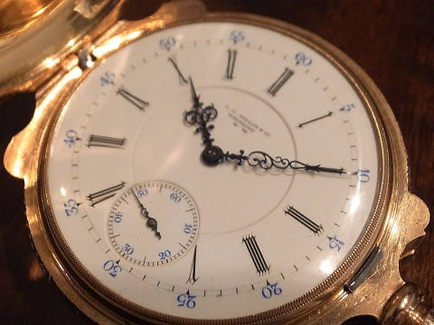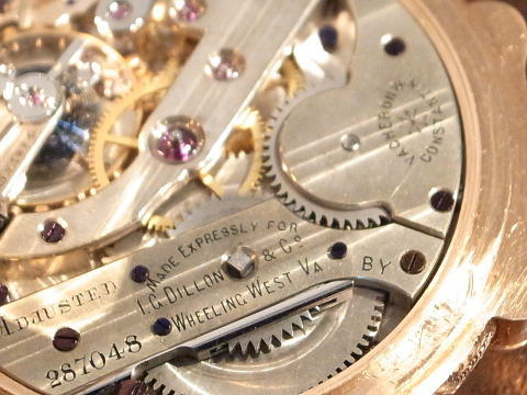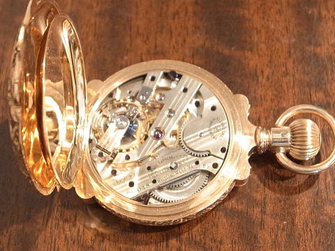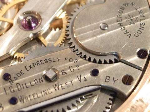 | コメント | バセロンコンスタンタンがアメリカの I G Dillon & Coに向けて製作した懐中時計です。 文字盤の青色とルイ針の濃い青焼きのバランスが素晴らし過ぎ。 実際に見て頂くと間違いなくお解り頂けます。 このタイプの機械で18サイズの物は非常に珍しく、大きくても16サイズ辺りですので、 間違い無く特注で製作されました。 機械にも MADE EXPRESSLY FOR I G Dillon & Co と刻印されております。 更にケースの彫金が超が付くほど極上、全面に施された彫金は誠に見事な出来。 最高級と言うに相応しい。 この様にケースサイドにも彫金が施されている物は中々見られません。 また、このサイズでボックスヒンジはアメリカならではでしょう、 手に持ちますと大きく迫力が桁違い。 当店にて完全分解整備済み、間違い無く十二分にお楽しみ頂けます。 リケースの可能性もありますが、当時は機械だけをアメリカに輸入し アメリカでケーシングした事を考慮しますとオリジナルの可能性もあります。 当店は基本的にリケース物は販売しませんが、これほど素晴らしい時計は別物です。 |