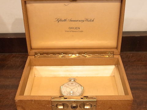 | コメント | かつてのGRUEN社が注文販売をしておりました懐中時計となります。 懐中時計をお持ちの方でしたら知らない人は居ないでしょう。 50周年記念で特別に製作されておりました超絶時計。 ブリッジは何と金無垢で製作されておりますので、手に持つとズッシリと重みを感じます。 何とも凄い時計を製作した事ですね。 そして元箱付き! これはこれで中々無い物ですので嬉しい限り。 この50周年時計は1924年から製作を初めて、おおよそ650個前後製作して来ました。 当時注文販売ですので、例えばケースの素材、デザイン、仕上げ等々選べたようです。 選べる代わりにその都度販売価格は上がったようですが。 こう言う話も懐中時計ならではの、面白い歴史。 当店にて完全分解整備済み、ご安心してこの素晴らし過ぎる時計をお楽しみ頂けます。 見所満載で素晴らしいの一言! |