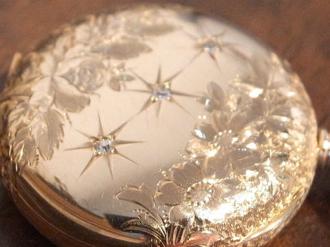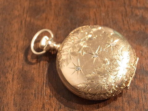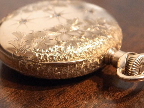 | コメント | ウォルサムが製造しました懐中時計となります。 何と言いましてもケースの彫金が素晴らしく、実際に見ると見事ですね。 表蓋、裏蓋そしてケースサイドにもあるのは珍しい、殆どが表蓋と裏蓋のみです。 そして裏蓋にはダイアが3個はめ込まれております。 かつてこの様に小型の時計でも、アメリカ時計は贅沢に製作されておりました。 当店にて完全分解整備済み、末永くお楽しみ頂けます。 これは良い時計です! |