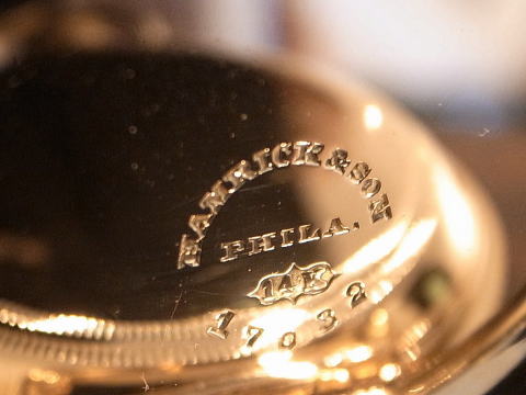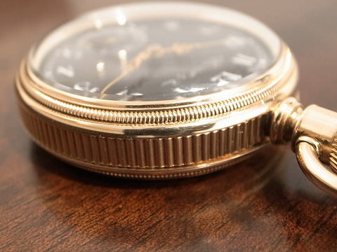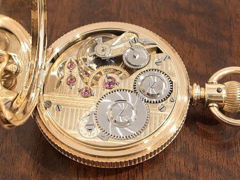 | コメント | アガシスがアメリカのHankick&Son社に機械を供給し製作された時計。 何と言いましても、エナメル製のブラックダイアルが印象的。 現代の腕時計でも見られますが、元祖は懐中時計と言うのはこれを見れば言うまでも無い。 ケースも非常に大きくそして分厚い。 コインエッジが非常に良いです。 エナメルのブラックダイアルとルイ針のコントラストも秀逸。 ムーブメンントは流石にアガシスと解る出来で、輝いており、勿論文字盤下にアガシスの刻印が有ります。 時代に伴う小傷、過去のメンテナンスに伴う小傷等ありますが、当店にてオーバーホール済みですのでご安心して この素晴らしい時計をお楽しみ頂けます。 手に持ってみて、かなりの時計と解る物は間違いなくお勧め! |