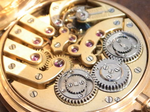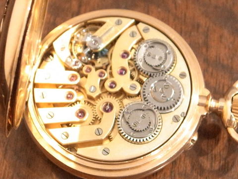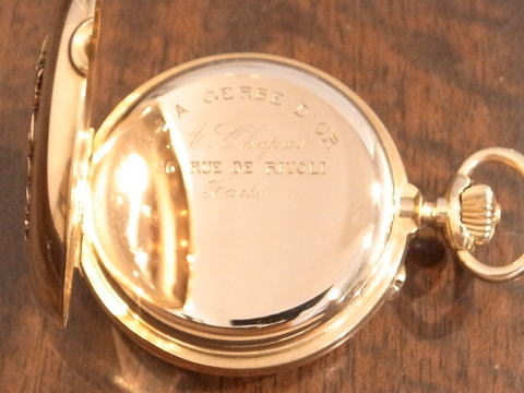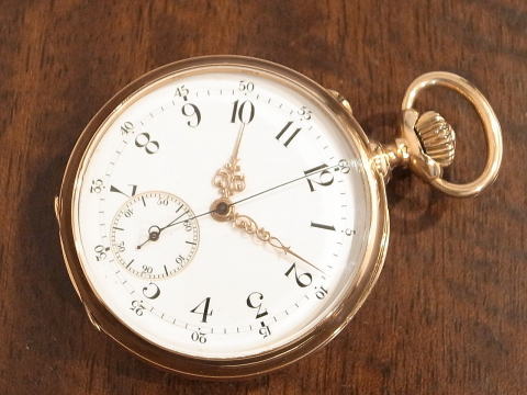 | コメント | スイス製の機械を使用しフランスで販売した懐中時計となります。 何と言いましてもダブルトレイン。 複雑時計の代名詞の様な物でしょう。 インディペンデント センターセコンドとは、通称ですが初期クロノグラフとも言われており、 この時計もリューズを押すことにより、スタートとストップが出来ます。 当時コンピューターなど無い時代において、設計図は全て手書き。 それを製品化するまでには想像を超える作業が必要であったのは見れば直ぐに解ります。 針と歯車がカチッカチッと進む動きは見事と感じる事でしょう。 この複雑極まりない機械を見ているだけでも、十二分にお楽しみ頂けること間違いありません。 当店にて完全分解整備済み、この逸品を末永くお楽しみ頂けます。 凄すぎ! |