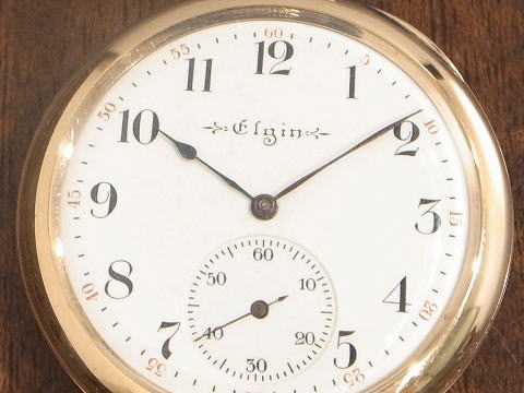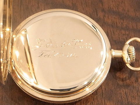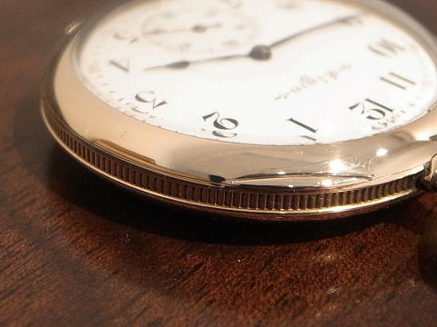 | コメント | エルジンのモデル194懐中時計です。 エルジンの最高峰、ご存知の方は多いと思いますが194は言うまでも無く素晴らしい時計。 製造個数は3000個と言われておりますので、かなり現存数は少ない。 機械は言うまでも無く最高峰ですので23石は当然ですが、2番車・3番車・4番車がゴールドトレイン、 テンプにゴールドプレート、そして装飾が本当に凄い。 実際に見ますと眩しい位に光を反射し、見えない香箱にもその装飾が施されている。 アメリカ時計でも素晴らしい物があると改めて解る逸品です。 時代に伴う小傷、過去のメンテナンスに伴う小傷は僅かにありますが、当店にて完全分解調整済みですのでご安心 この素晴らしい時計をお楽しみ頂けます。 言う事は無いでしょう! 素晴らしい! |