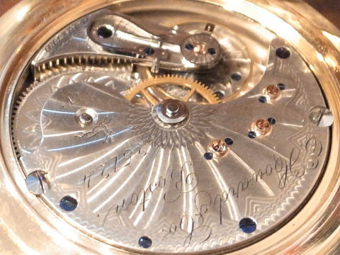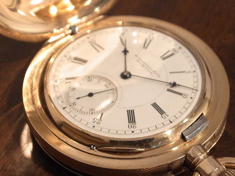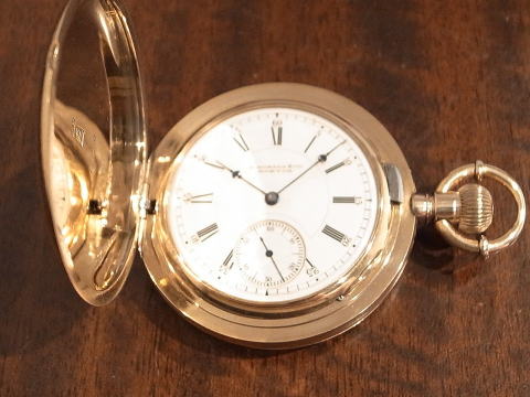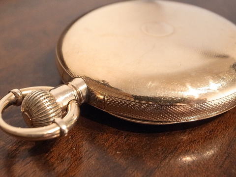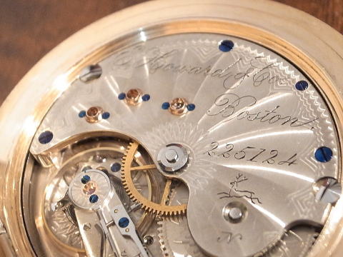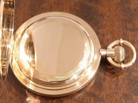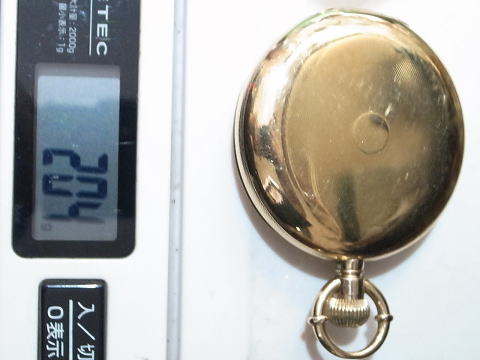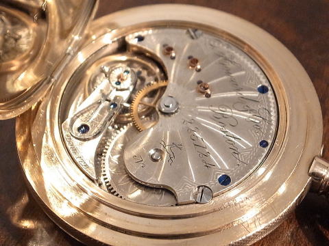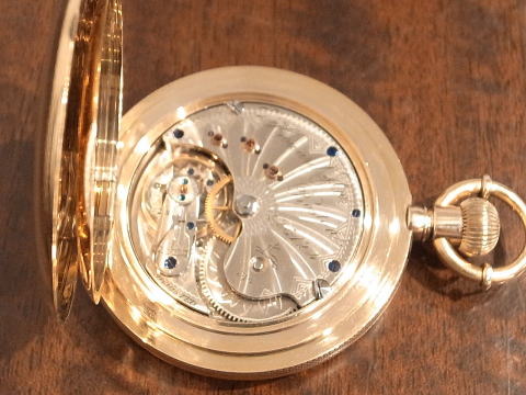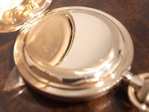 | コメント | 通称オールドハワードと言われる懐中時計です。 まずこの凄まじ過ぎる時計に驚きです。 実際に見て手に持つと言葉が出ません。 総重量は何と、204g !!! まさに金塊。 規格外!!! ケース径は何と、61.5mm !!! リューズが含まれ無い状態で、この BIG サイズ!!! 大型の超複雑時計でも200gを超える事は、ほとんど有りませんので、 3針単体での204gは想像すら出来無いでしょう。 シルバーケースでさえ、200gを超える事は中々無く、 それが金無垢ですので、まさに物が語るとはこう言う事で間違いありません。 時計としては勿論ですが、初期のアメリカは恐ろしい程の贅沢品が存在したものだなと納得。 当時のアメリカの底力を感じますね。 当たり前ですが特注品ですし、どの様な方が注文されたのか、それだけでも興味深い。 時計と同じで間違い無く、超が付く大富豪でしょう。 それにしても何という時計を制作したものだなと、見る度に思わせてくれると同時に、 良くぞ残ってくれたと思います。 またケースだけで無く、機械も素晴らしい。 ムーブメントの模様は通常と違い見事に輝いております。 再青焼きネジとのコントラストは見応え抜群。 このタイプの機械模様は珍しいですね。 なかなか見られる物ではありません。 当店にて完全分解整備済み、ご安心してこの素晴らしい時計をお楽しみ頂けます。 圧倒的な迫力、そして恐らく二度と巡り会うことの無い規格外の逸品は最高です! |