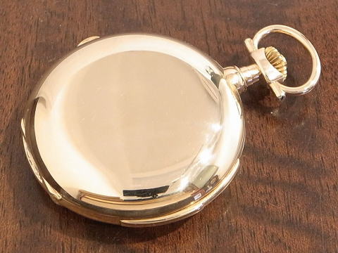 | コメント | 14金無垢イエローゴールドのミニッツリピータークロノグラフ懐中時計です。 ケースにLF&Cの刻印がありますので、恐らくLanders, Frary,& Clark社が製作したと思われます。 Landers, Frary,& Clark社は懐中時計関係も製作していた様ですので間違い無いでしょう。 何と言いましてもミニッツリピーターにクロノグラフ付きですので、機械を見て頂くとその複雑さが見て取れます。 ハンマー軸にもルビーが入れてあり、これぞ高級な機械。 リピーターはケースサイド約6時にありますスライドレバー、また12時のボタンでクロノグラフが作動致します。 製作年代は1800年後半と思われ、約100年以上前の人が聞いていた音を同じく聞ける辺りは 懐中時計ならではの歴史でしょうか。 文字盤、機械、ケースと言う事は無いでしょう。 時代に伴う小傷、過去のメンテナンスに伴う小傷は僅かにありますが、当店にて完全分解調整済みですので ご安心してこの素晴らしい時計をお楽しみ頂けます。 やはり複雑時計は素晴らしい! |