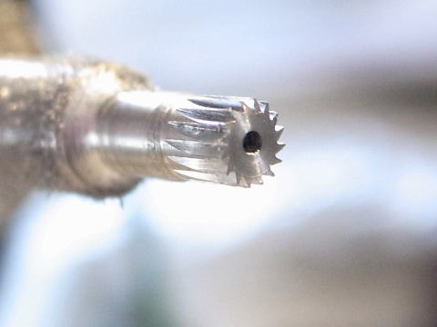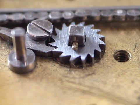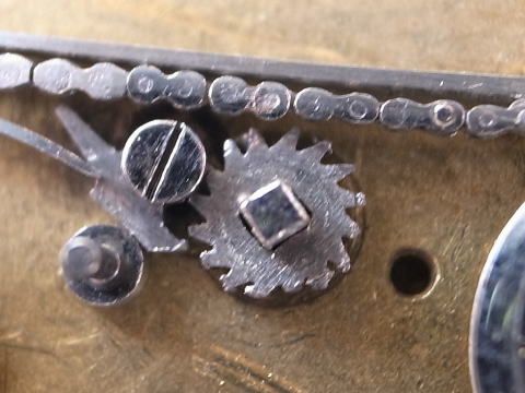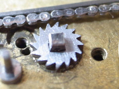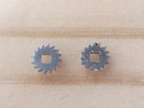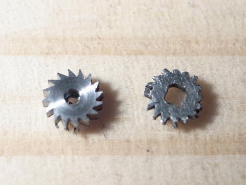| 悪くなってしましました歯車の新規製作です。 鋼を元の部品と同じ大きさに削り、その後歯をカットして切り取ります。 この時に大きくても小さくても周りの部品に関わって来ますので完璧さが必要。 その後完璧な四角の穴を開けます。 四角の穴の位置も重要なのは当然、中央でなければ使用出来ません。 開け方は、鑢ででは無く部品を別作してです。 詳しくは開けると言いますか。。。ご想像ください。 穴の大きさも言うまでも無く非常に重要、元軸と完全に一致しないと緩みます。 この緩みは長年使用して行きますと、穴が大きくなり最終的には軸も再作成の可能性もありますので 完全に一致させることが理想です。 焼き入れ焼き戻しなどを行い、元の部品と同じ様に研磨を施し完成となります。 これで完璧に復活ですね。 |