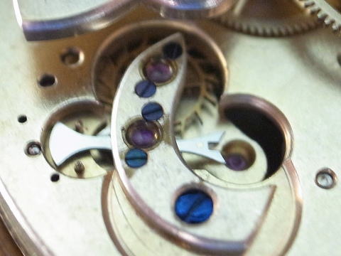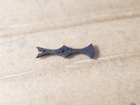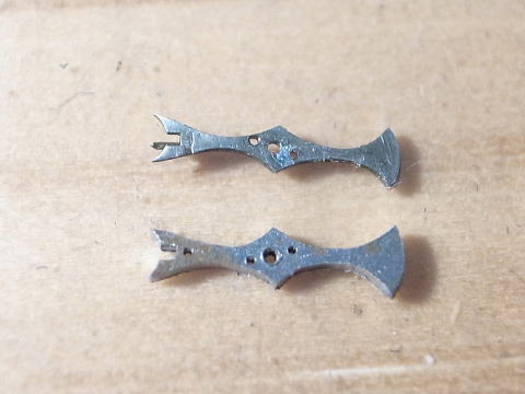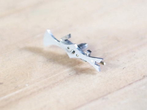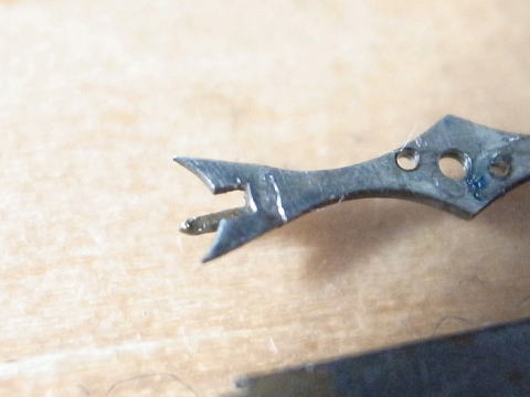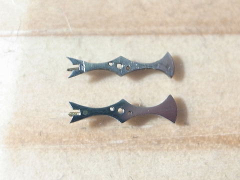 | 脱進機の部品が壊れており、半田で取り付けてありましたので、 新規製作は必須でしょう。 時々半田で修理した痕を見ますが、 半田での修理は修理では無いですね。 ですので完全に修理した方が間違い無いです。 完璧に穴の位置が合わなければ何度でも再製作となります。 また、真ん中の穴はネジ切りが必要ですので、 ネジ切りを施し完成。 穴の径は0.2mmなどですので、簡単ではないのは 直ぐにお解り頂けるかと思います。 新規製作した物と、元の部品での違いは? 有りませんね。 これで長い年月使用して頂ける事でしょう。 |