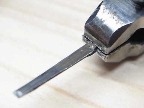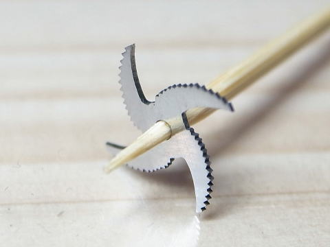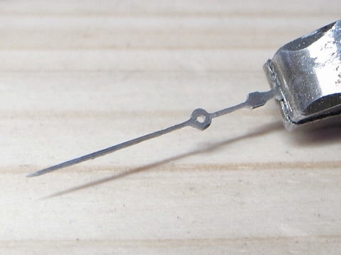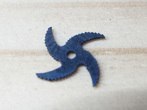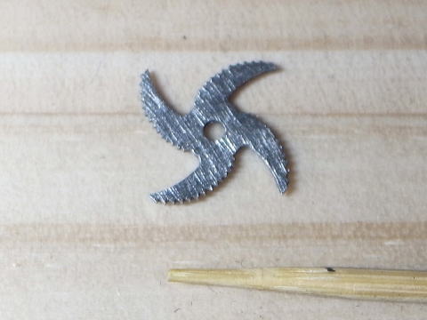 慎重にカットして行きターゲットとする厚さに加工した後に、焼き入れ焼き戻しを施し磨きます。 パーツの資質上、完璧なフラットさも要求されます。 爪楊枝の先が太く見える位の幅をカットして行きますので、極めて困難な作業とお解りただける事でしょう。 |