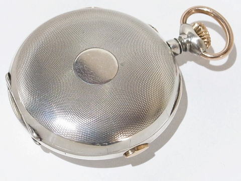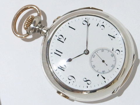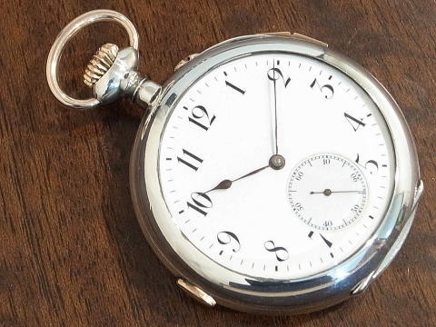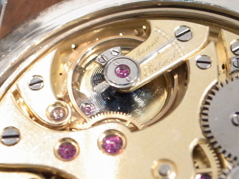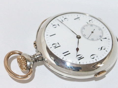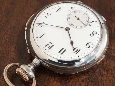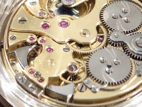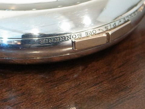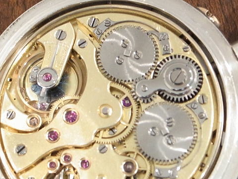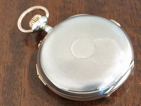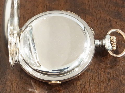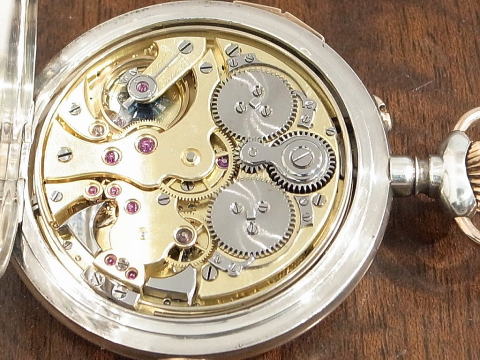 | コメント | 懐中時計の最高峰、グラン プチ ソヌリ、ミニッツリピーター クロックウォッチ。 複雑時計の中で圧倒的な存在であるグランプチソヌリ、しかもミニッツリピーター。 グランソヌリとはご存知の方も多いと思いますが、自動で15分おきに鳴る事を言います。 因みに消音が出来ないタイプはグランソヌリとは言いません。 この時計はグランソヌリとプチソヌリがスイッチ1つで切り替えることが出来、 金無垢ボタンを押す事でミニッツリピーターが作動し鳴ります。 グランソヌリには幾つかのタイプが有りますが、この時計はグランソヌリの時には 毎時15分おきに時刻とクゥオーターが自動で鳴ります。 例えば2時15分になりますと時刻の2回と1回のクォーター、 2時30分になりますと、時刻の2回と2回のクォーターが自動で鳴ります。 プチソヌリは時刻は鳴らさないでクォーターのみを鳴らします。 しかも1つのスライド式金無垢レバーで消音までの操作が出来る辺りは言う事が無いですね。 ゼンマイを巻き上げるダブルトレインも当時の特許を使用するタイプ。 ピカピカのシルバーケースの輝きと、金無垢の輝きのコントラストが見事、 実際の時計は言うまでも無く画像よりも遥かに綺麗。 手に持つと間違いなくその素晴らしさが伝わります。 画像では光の関係で少し暗く写っているだけ。 銀無垢を磨きますと非常に綺麗なのは、例えばジュエリーを見て頂くと解ります。 エナメルダイアルも極上、全てにおいて言う事は無いでしょう。 当店にて完全分解整備を施し、パーツの再研磨などを行い極上状態に仕上げて有ります。 この様な逸品は見る事自体が稀。 非常に満足度が高く、所有する喜びに溢れた時計です。 別料金にはなりますが、当店にて中蓋をシースルーバックに変更する事も可能です。 その場合は勿論オリジナルの中蓋とは別に製作いたします。 全てにおいて最高の状態で凄すぎの時計、言う事無しの超複雑時計は言うまでも無く家宝物! |